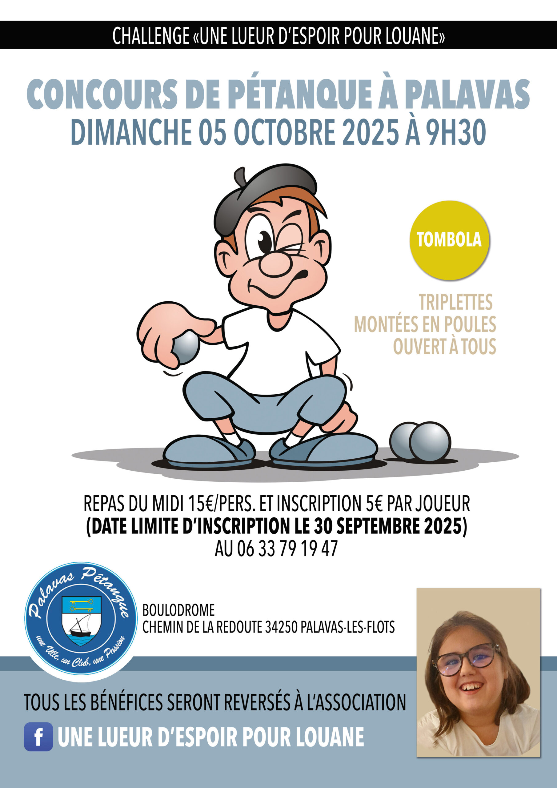 Pour plus d’informations ou pour vous inscrire, contactez le 06 33 79 19 47 avant le 30 septembre. Ne manquez pas cette occasion unique de jouer sur les terrains superbement préparés de Palavas-les-Flots, tout en aidant à faire briller une lueur d’espoir pour Louane. Venez nombreux pour soutenir cette cause méritoire et profiter d’une journée de détente et de sport !