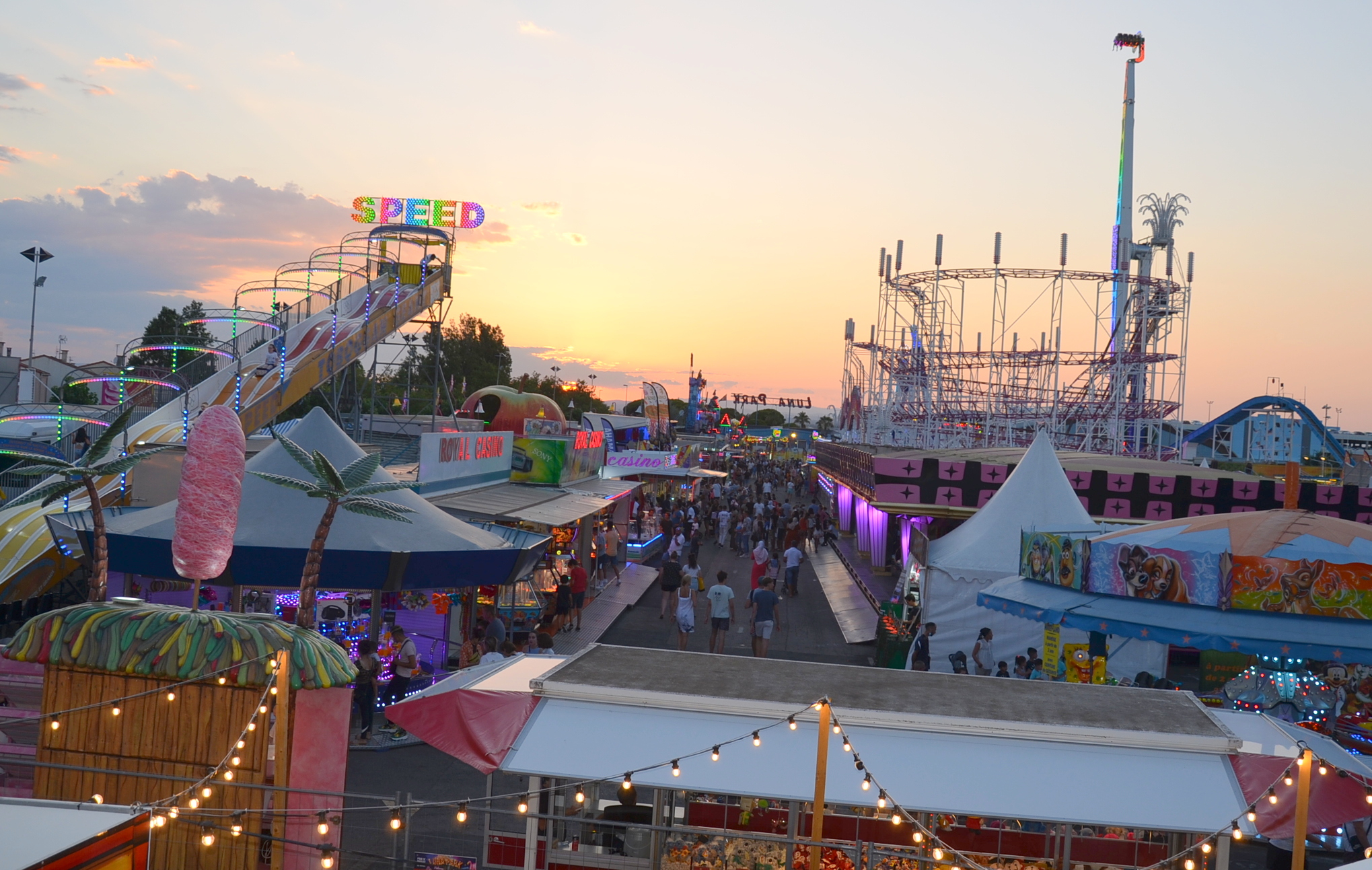 Tous les soirs de l’été, à partir de 20h30 et jusqu’à 1h du matin, le parc d’attraction s’illumine et offre aux amateurs de sensations des manèges défiant les lois de la gravité et pour les gourmands des friandises à déguster.